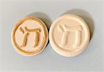 This round ceramic has a chai on it. It has a 1 3/8" diameter. It is flat backed so a magnet can be added if desired. Paints not included.