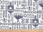 On this Hanukkah fabric full of the Hanukkah symbols the design is a dark navy on a white background. In addition to menorahs, dreidels, stars of David and a beautiful little dove of peace, there are words and sayings. It says "Festival of Lights", "Menorah", "Friends and Family Spin the Dreidel" and more. The largest image is a 3" tall by 1 1/2" dreidel. The smaller images are 1". It is 100% cotton and 45" wide. Please use the dropdown to select quantity. Total amount ordered will be sent in one uncut piece.