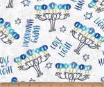 This Hanukkah fabric represents the lights of Hanukkah. When you need a slightly larger design, this is it. The menorahs are 3" wide and 2 3/4" tall. Between menorahs are the words "Happy Hanukkah" and "Love and Light". It is 45" wide and 100% cotton. Price shown is per yard. Please use the dropdown arrow to select quantity. Total quantity ordered will be send in one uncut piece.